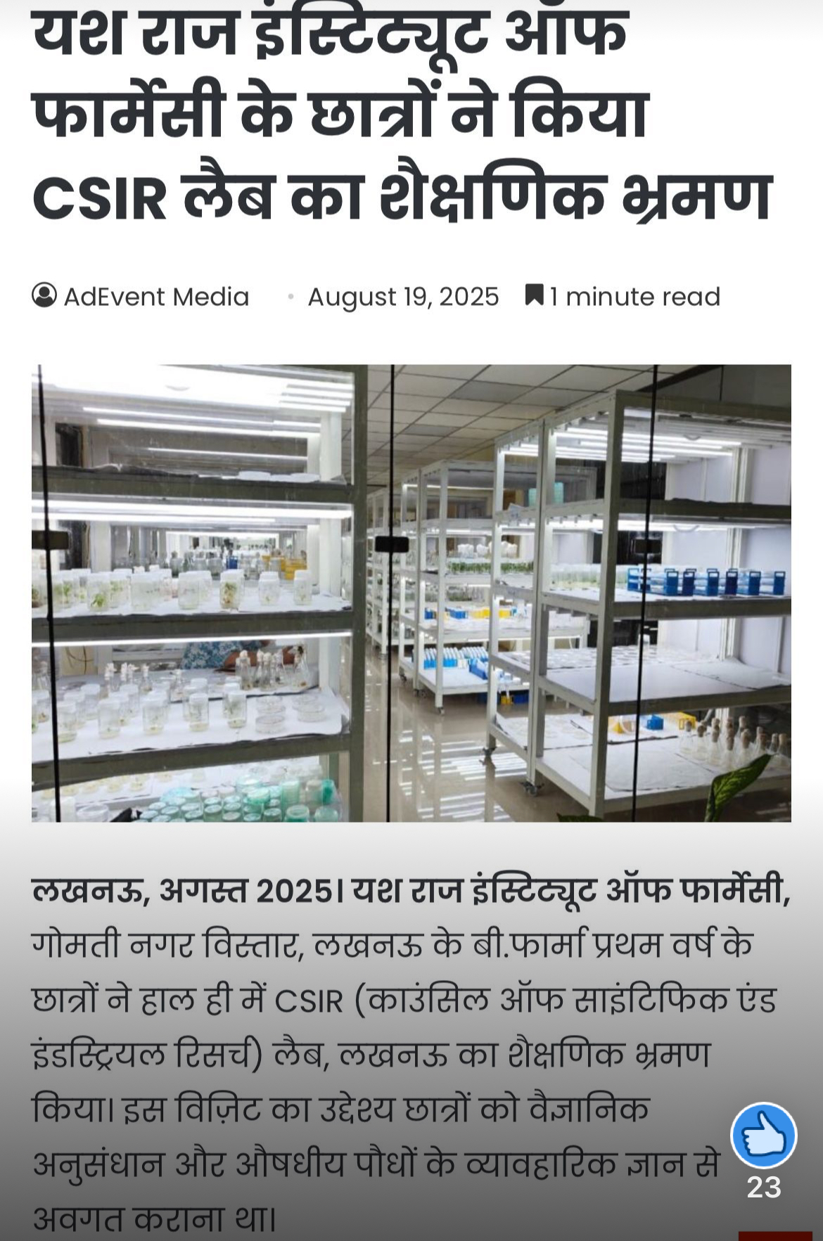 On the occasion of CSIR-CIMAP Annual Day, students of Yashraj Institute of Pharmacy, Lucknow had the unique opportunity to visit the Central Institute of Medicinal and Aromatic Plants (CSIR-CIMAP) — a premier national research institute under CSIR, Govt. of India.